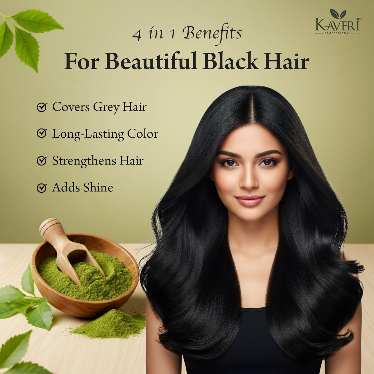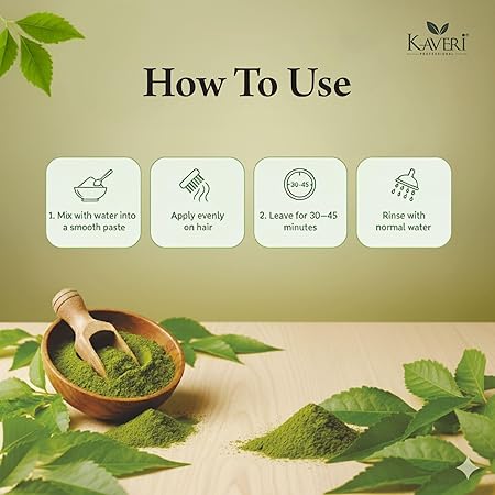 Kaveri Henna Hair Color is enriched with 9 vital herbs, including Henna Leaves, Mehendi Powder, Amla, Shikakai, Hibiscus, Aloe Vera, Methi, and Bhringraj—known for their natural hair care benefits.